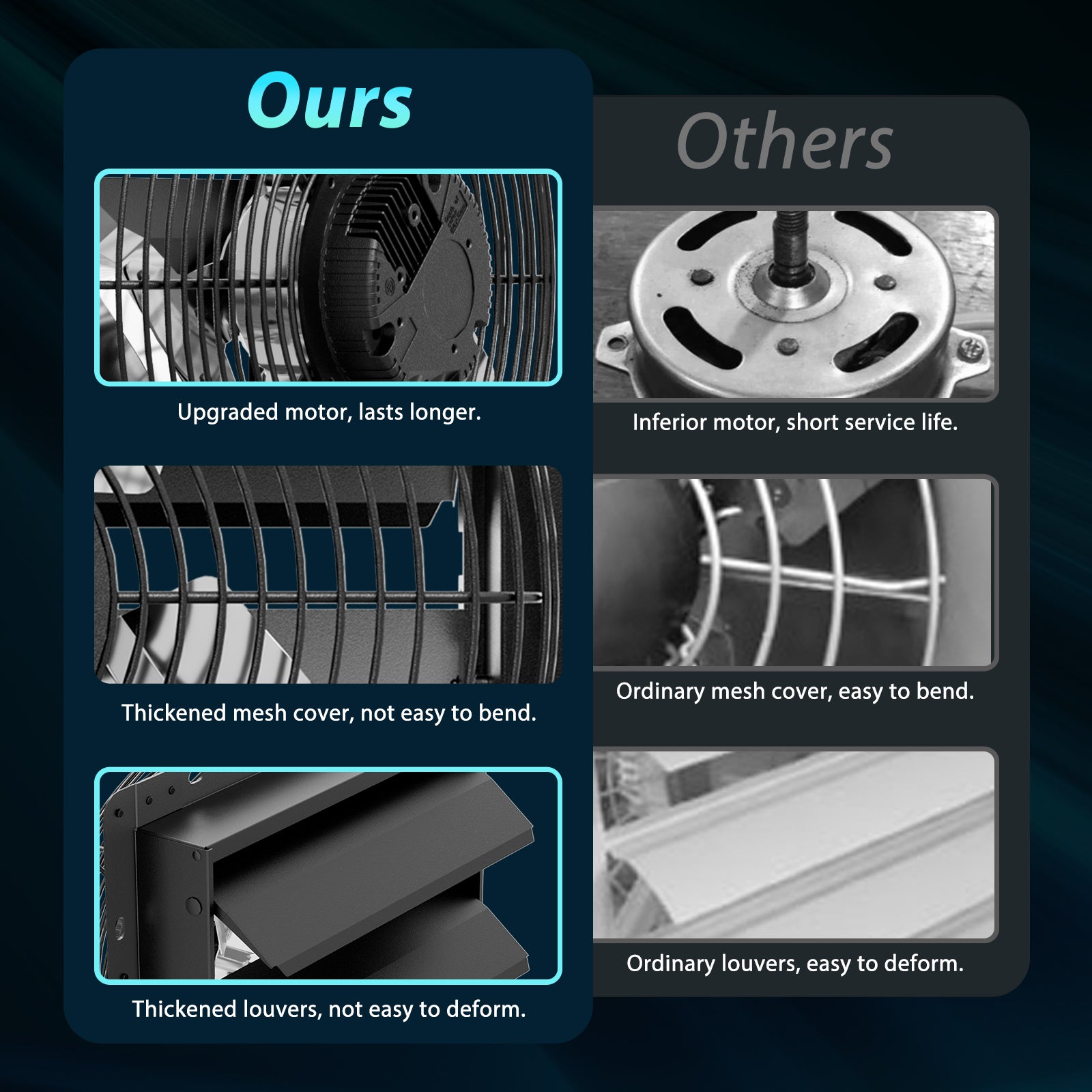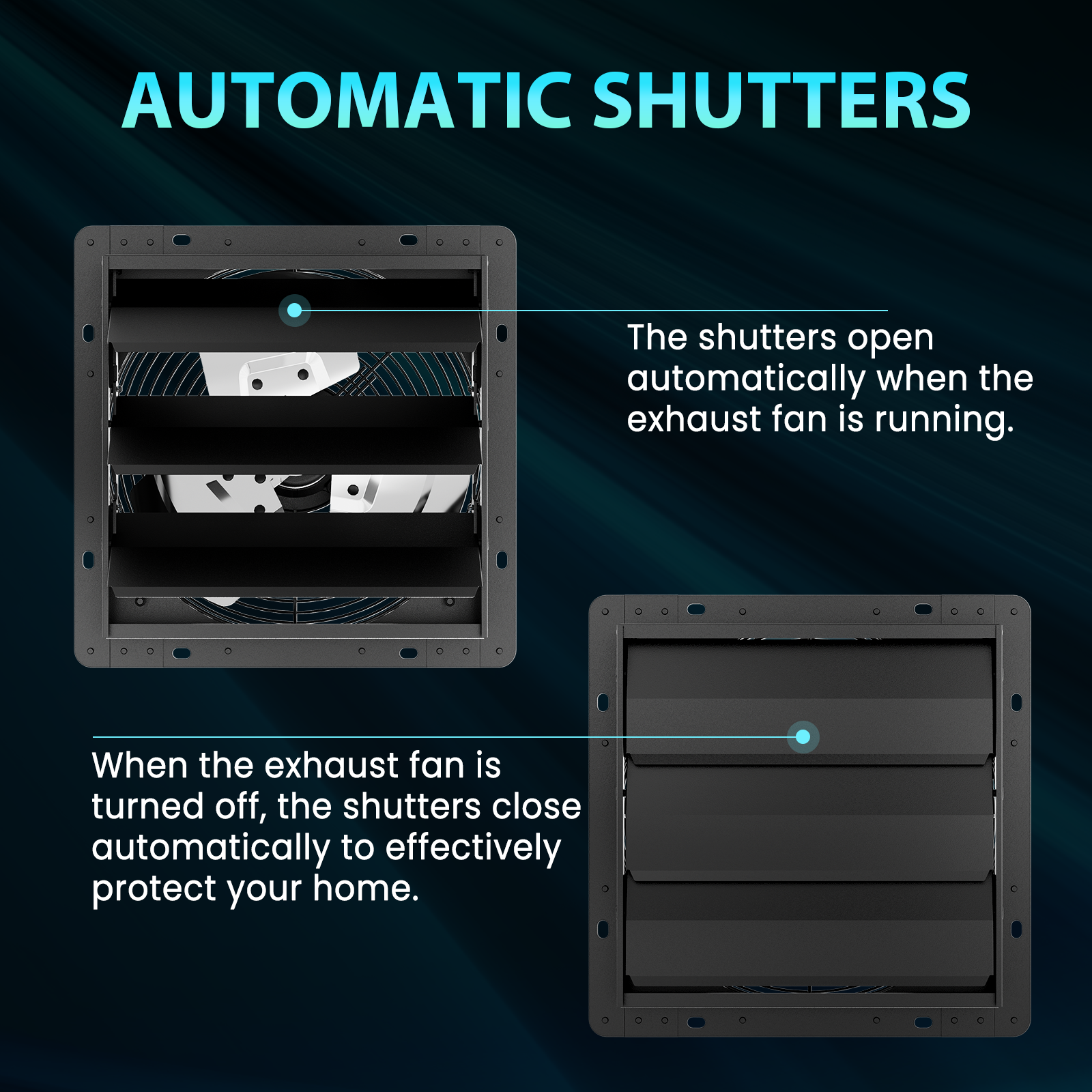 - Durable Build: Built with sturdy metal shutters and a robust motor, this shutter exhaust fan resists weather, suitable for wall mounting in basements, barns, and outdoor applications