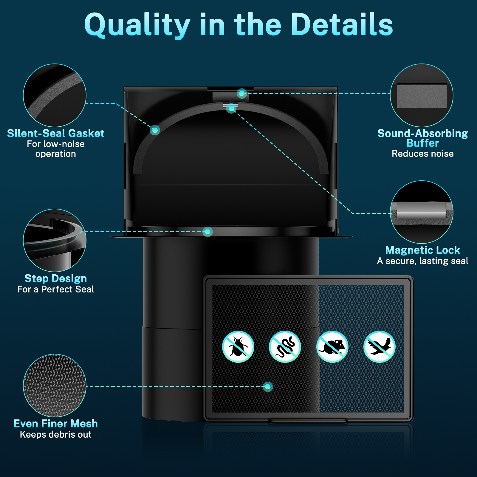 - ✔ Superior Seal:This hooded exhaust vent cap utilizes dual-sealing mechanism - Magnetic + Step-Seal System. A built-in step ensures gravity-assisted closing, while a magnet provides a secure, airtight seal. This design effectively prevents backflow and ensures quiet operation, making the hooded cover exceptionally reliable